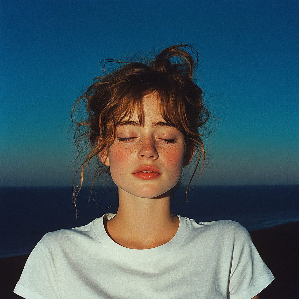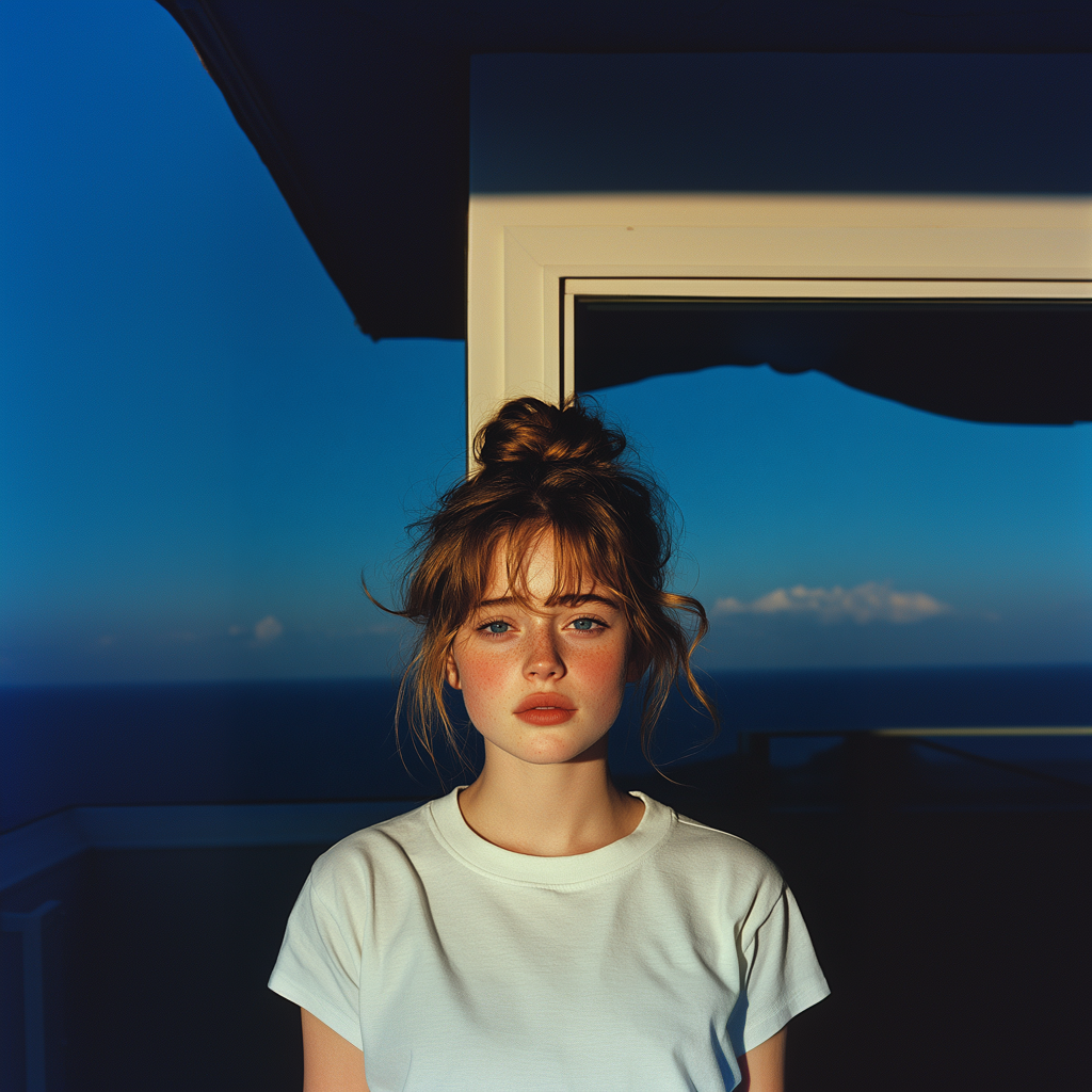 Enter a world suspended between day and night, where deep azure skies meet golden sunlight in moments of quiet contemplation. This style captures the liminal beauty of twilight hours through a sophisticated palette of teal, indigo, and cerulean blues, punctuated by warm amber and honey-toned highlights. The aesthetic evokes the timeless quality of analog film photography, with subtle grain, desaturated earth tones, and a color grading that feels both contemporary and nostalgically vintage.